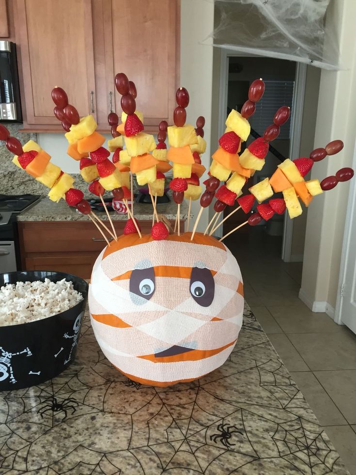 Next grab 20-30 wooden skewers (find some here) and begin sliding red and green grapes in an alternating pattern onto the wood skewer. Top the end with a strawberry. Push the sharp point of the skewer into the top of the pumpkin and continue filling in the top with more fruit kabob skewers.